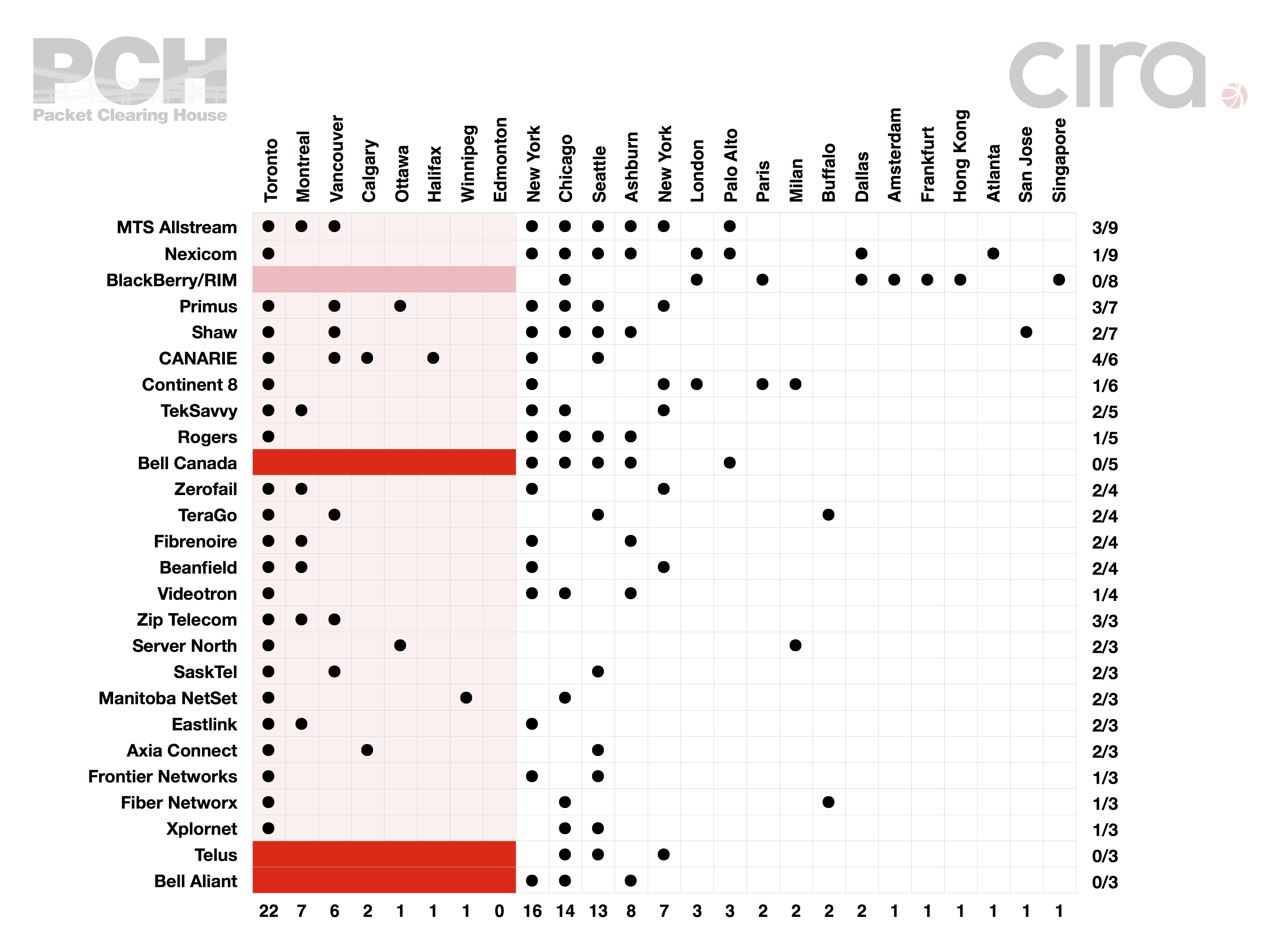 Numerous factors influence the route that data takes across the internet. While there is a popular understanding that data takes the most efficient path to its destination, much more important are the agreements that the various carriers make between themselves to inter-connect their individual networks that together constitute the internet. Cost saving is an obvious consideration. The cheapest path may not be the shortest because investments in capacity tend to be along existing routes (e.g. along rail lines) or those with higher value traffic. But anti-competitive business strategy can be an over-riding factor. Large incumbent carriers take advantage of their dominance to force their smaller competitors to incur relatively greater costs with more circuitous and international routing. This is especially evident with same-city boomerang routing, as seen with TR ????, in which a data path originating and terminating in Toronto passes through the same internet exchange, at 151 Front Street, on its way to and from the US. As shown in this table, two of Canada's largest carriers, Bell and Telus, do not peer with any other carriers inside Canada. This means that any subscribers of these ISPs will incur boomerang routing to reach any other domestic ISP. Source: Woodcock, 2016. See IXmaps Boomerang video.