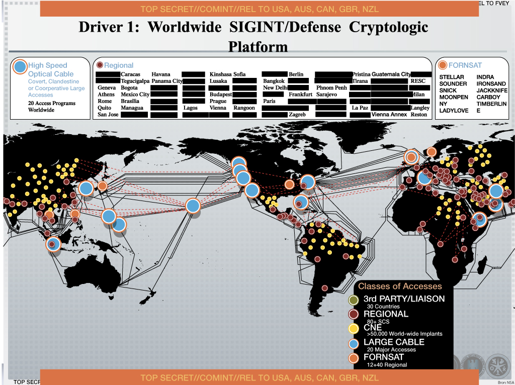 This NSA slide released by Snowden summarizes the various Five Eyes surveillance operations worldwide. The blue dots refer to the 20 large scale, high speed optical cable interceptions at major global gateways, green dots to 30 national interceptions and the reddish dots to 80 regional interceptions in major cities.