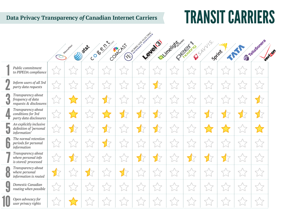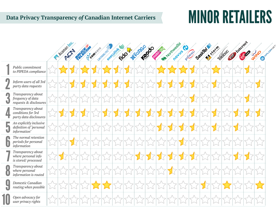 Responding to these concerns, as well as in keeping with the transparency, openness and accountability principles fundamental to Canadian privacy law, this is the second annual report that evaluates the data privacy transparency of the most significant internet carriers serving the Canadian public. We award carriers up to ten ‘stars’ based on the ready public availability of the following information: